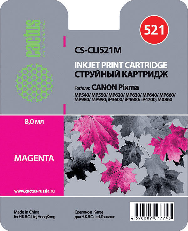 Интернет-магазин.Картридж струйный Cactus CS-CLI521M красный (magenta) для Canon Pixma iP3600/4600/MP540/620/630/980Артикул #126889 Склад/Заказ:На складе